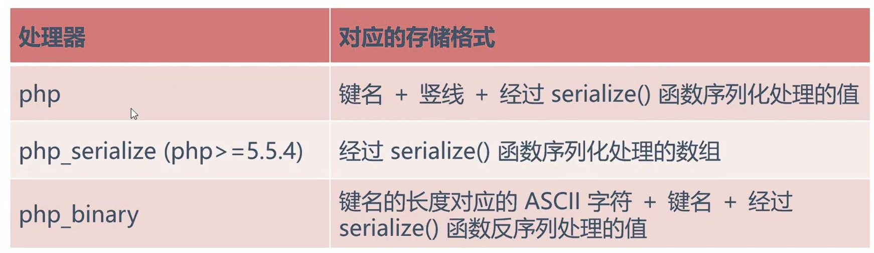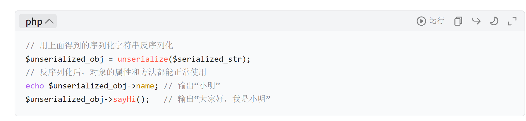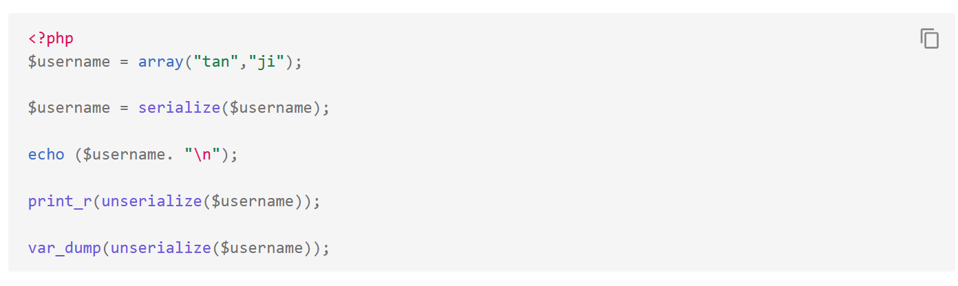 unserialize():接收合法序列化字符串,返回对应的原始数据类型(对象 / 数组 / 字符串等);若字符串格式非法,返回 false。