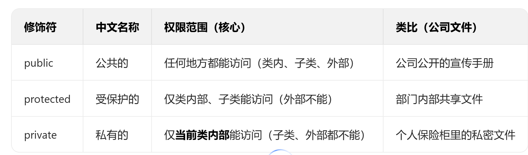 一创建一个类的子类,它就具有父类除 private 以外的全部成员变量和成员函数,“访问” 就是「读取 / 修改 / 调用」。