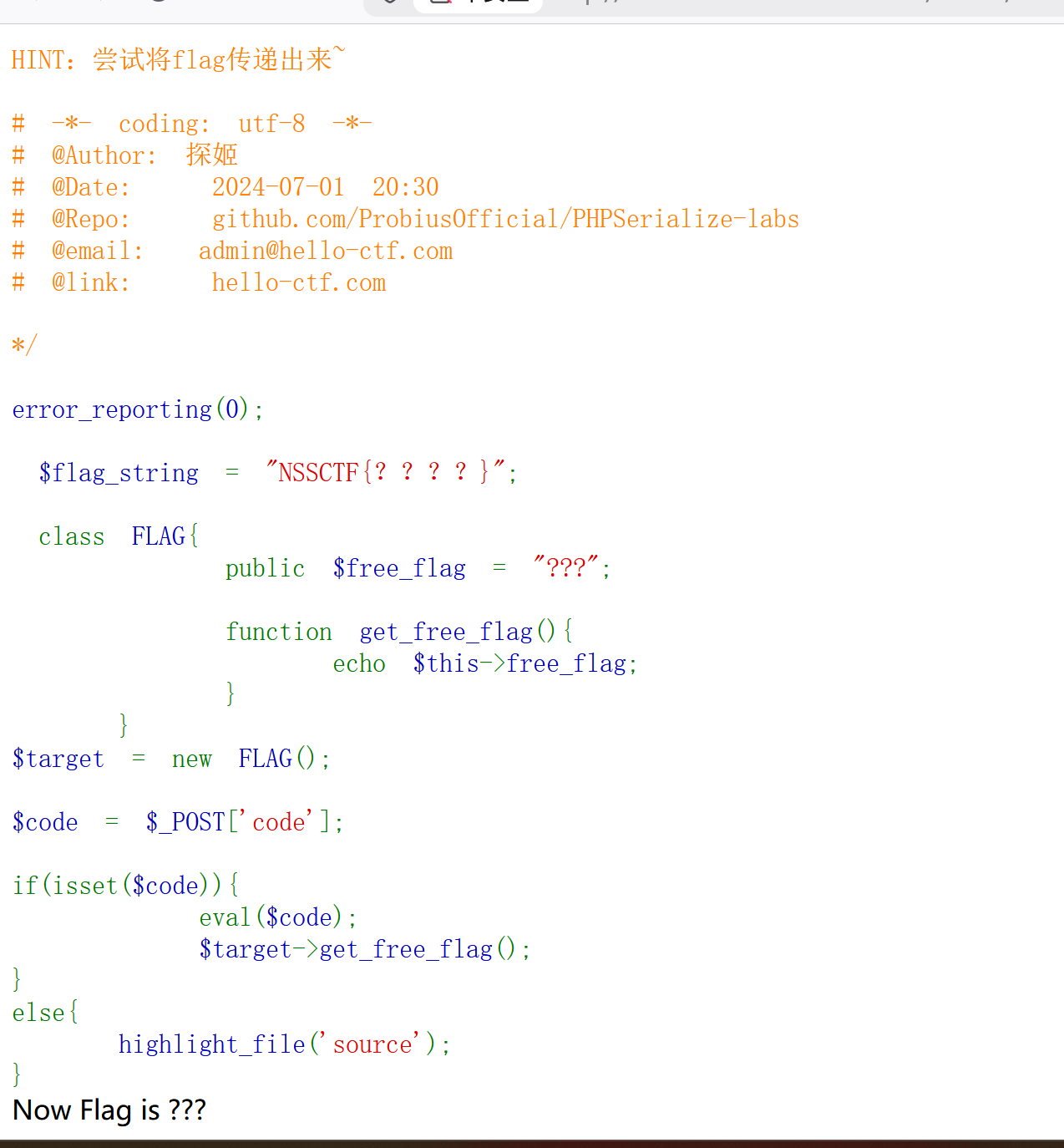 注,这里输入的 code=$obj=new FLAG();”$obj=new FLAG()“会以纯文本形式被 PHP 接收,而不会被当做赋值运算符的运算表达式从右到左执行,为 code 直接赋对象 FLAG(__$code__始终是字符串,不是对象)
