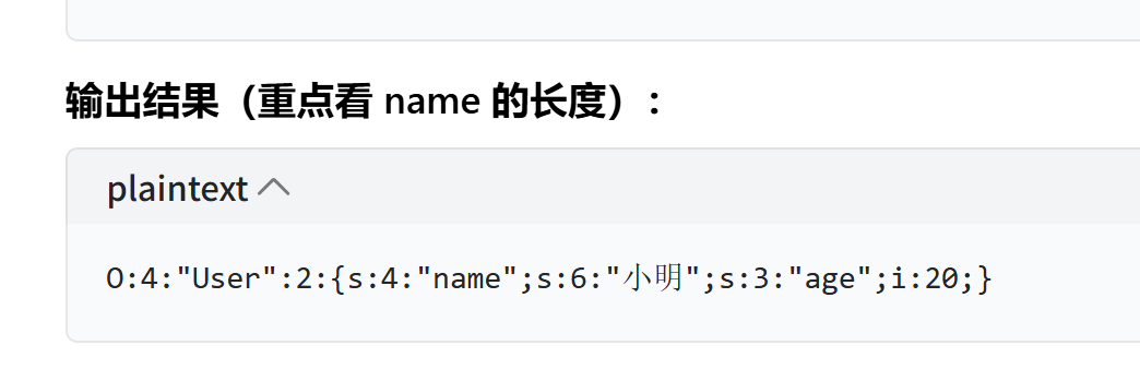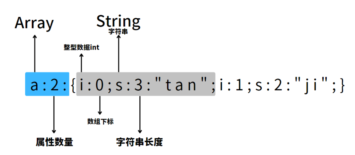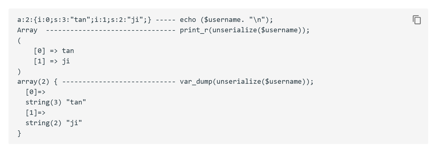 1 | O:4:"User":3:{s:4:"name";a:2:{i:0;s:3:"tan";i:1;s:2:"ji";}---------- public$name; |