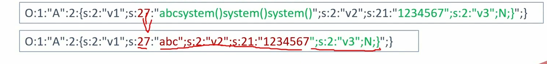 先读本题提示:序列化和反序列化的规则特性,字符串尾部判定:进行反序列化时,当成员属性的数量,名称长度,内容长度均一致时,程序会以 “;}” 作为字符串的结尾判定。