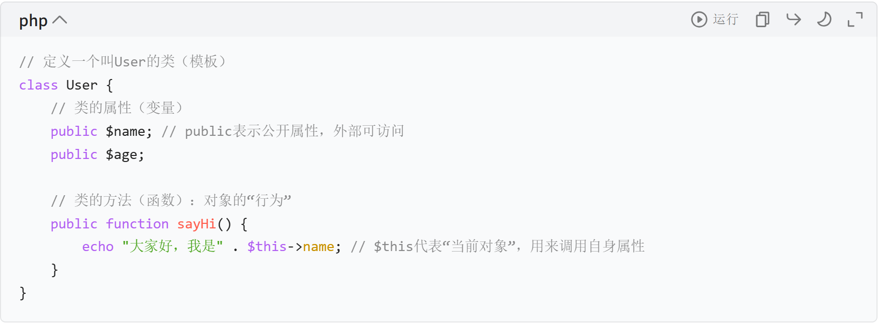 - 关键:每个对象都有自己的属性值,但方法(行为)和类保持一致 —— 就像 “小明”“小红” 都是 “User 类” 的对象,但名字、年龄不同,都能 “打招呼”。