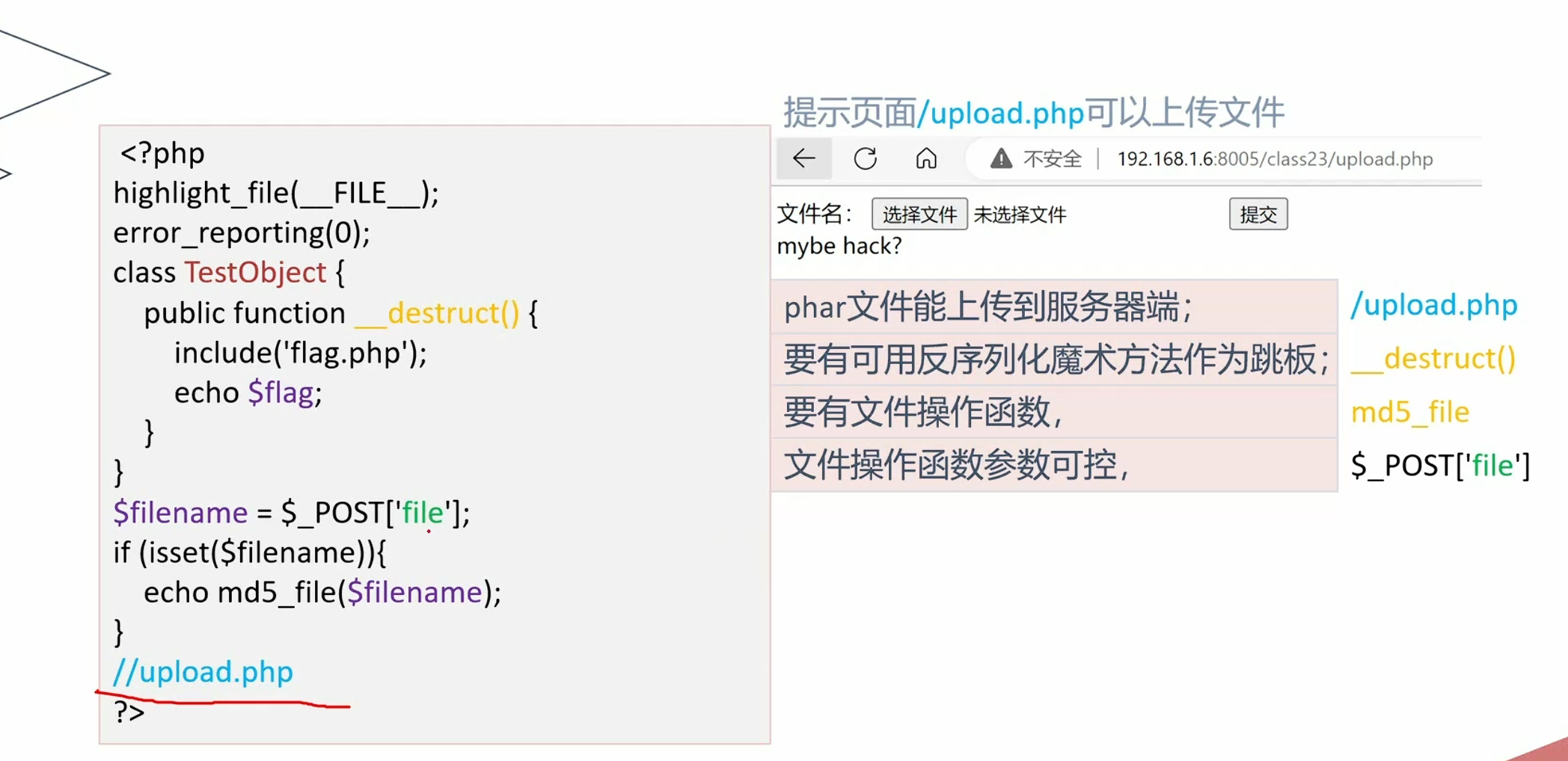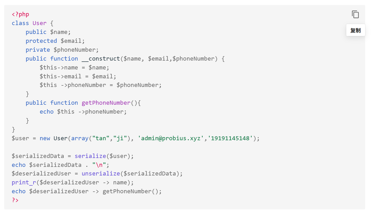 unserialize()的参数(序列化字符串)是攻击者能修改的(比如通过 GET/POST 传参,如unserialize($_GET['data'])); - 代码中存在 “危险魔术方法”:反序列化过程中会自动触发某些 “魔术方法”,如果这些方法里有