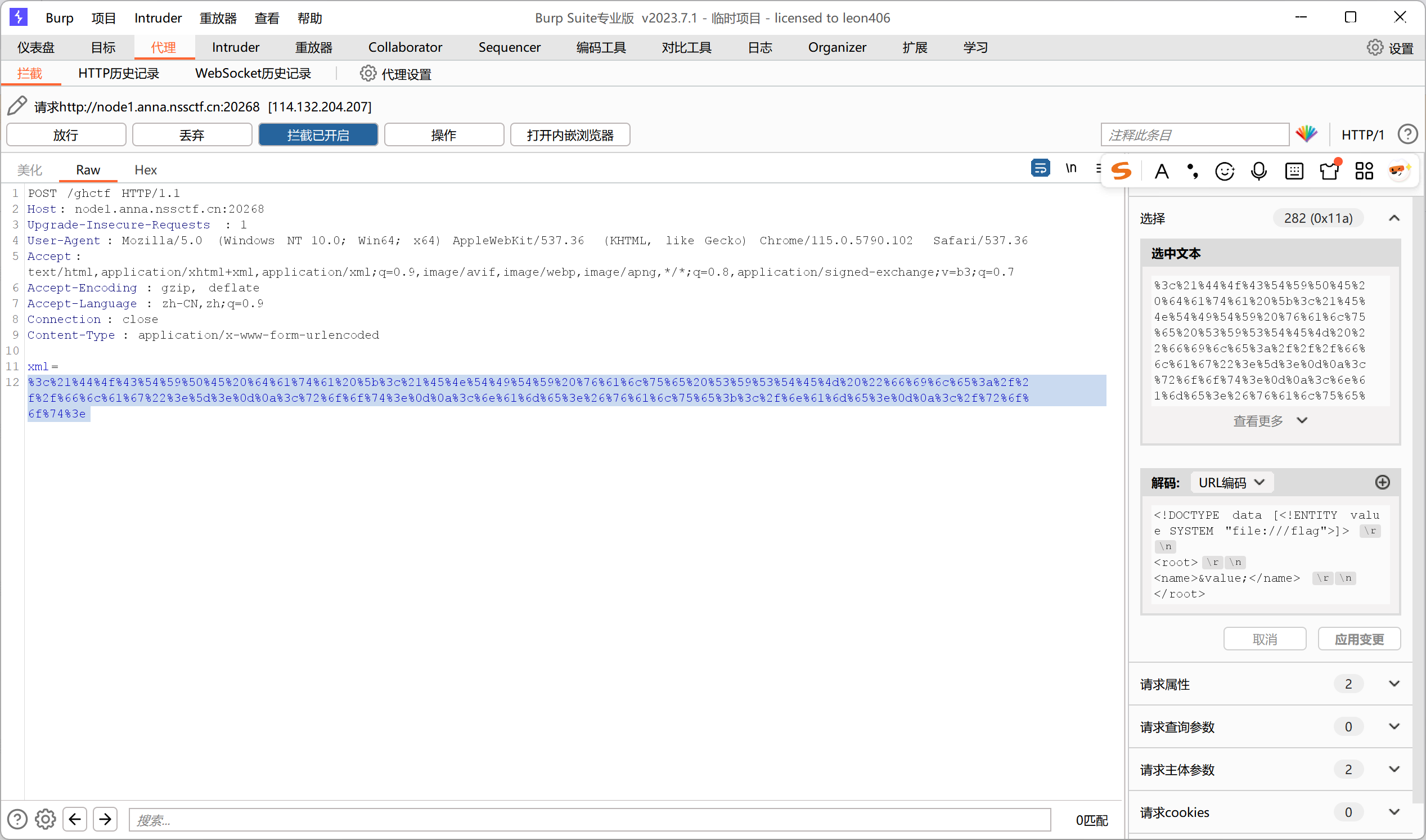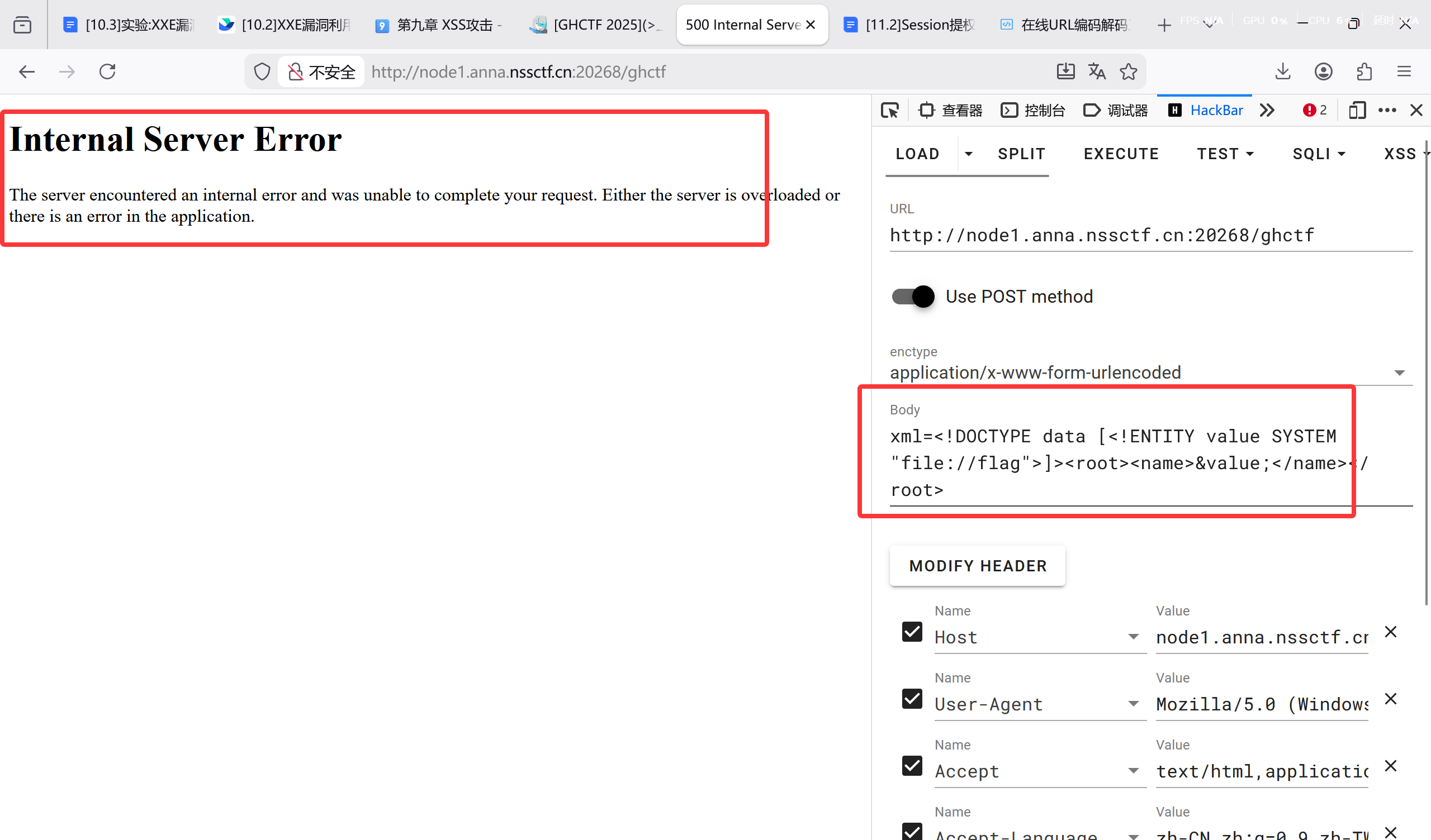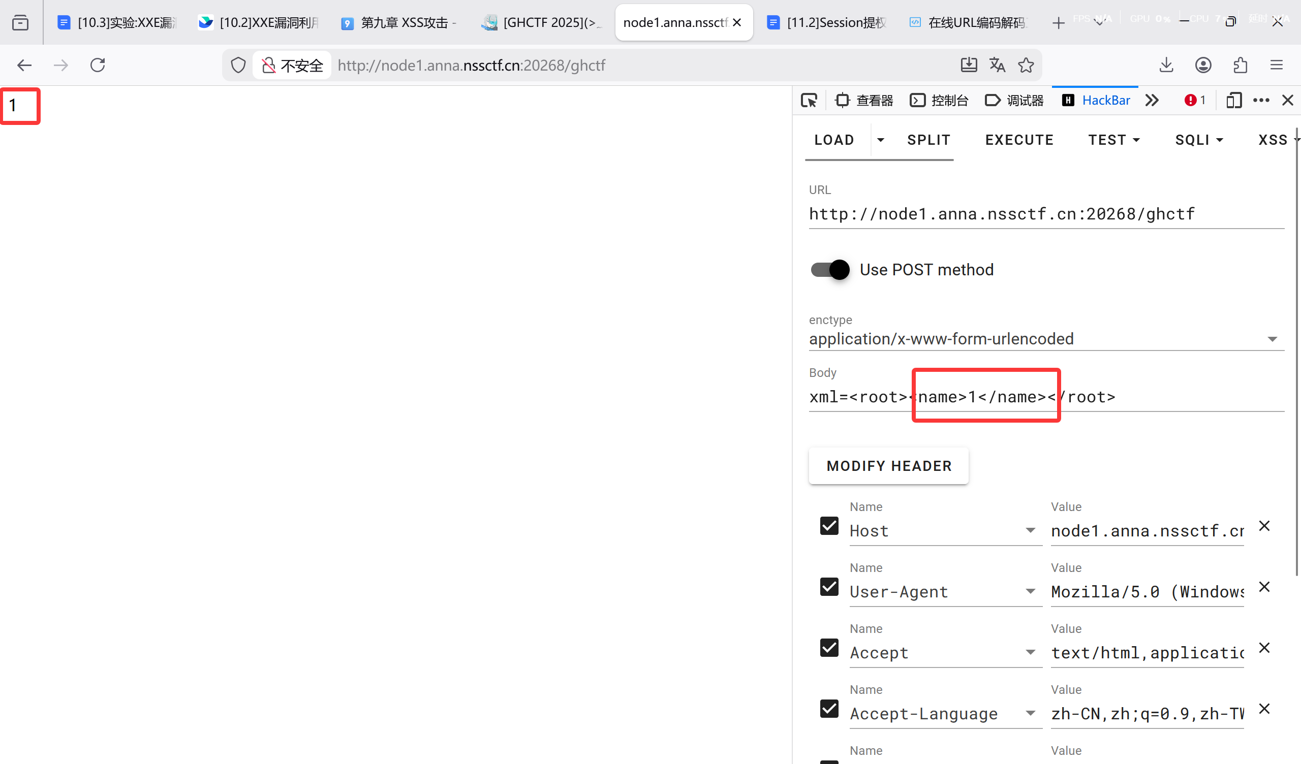 我们要用 POST 方式去访问/ghctf(用 get 它就给你报错) 第 14 行 xml 应该可以通过递表单修改,但是不知道是 get 还是 post,还是都行