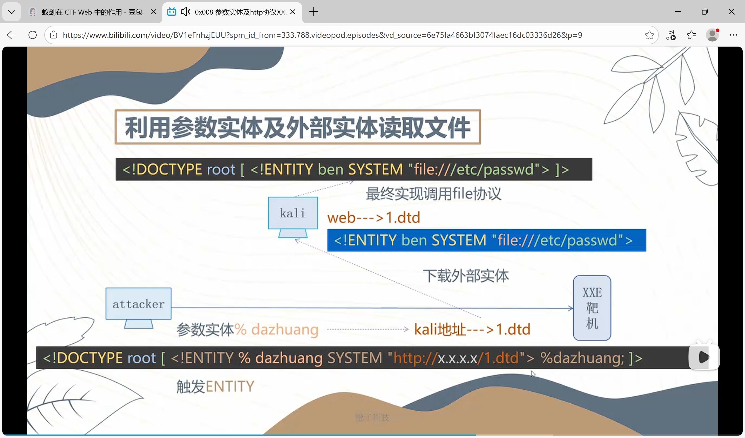 这样就用了一个变量代表你需要注入的 DTD 格式,并通过引用这个变量来执行它