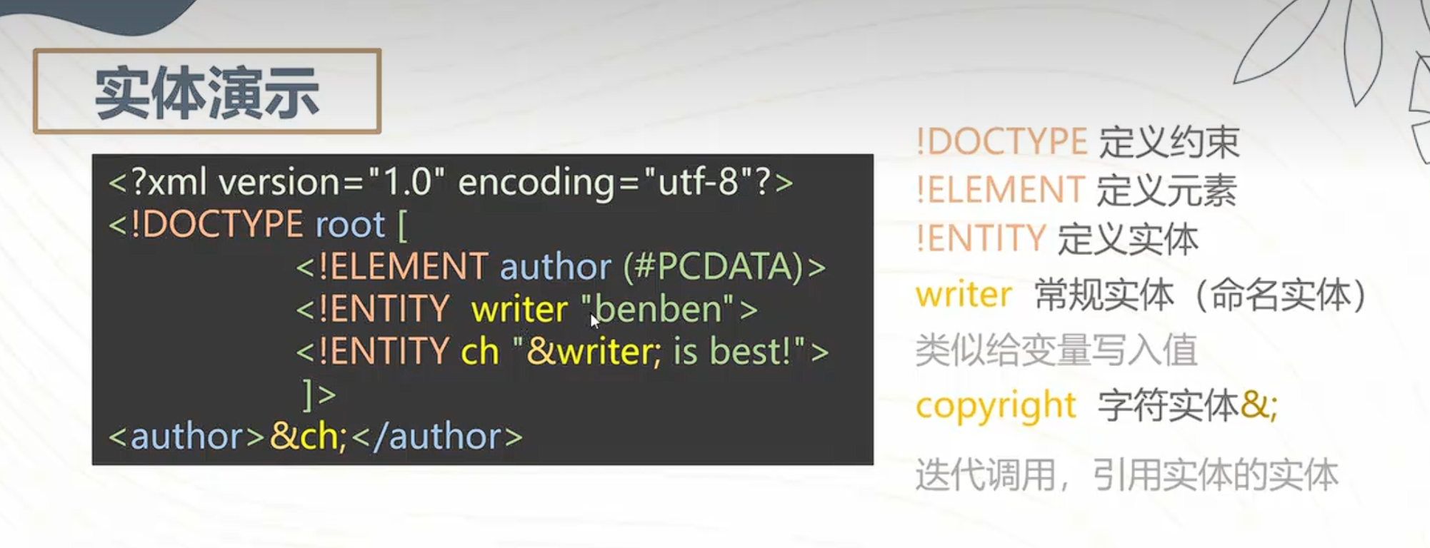 命名实体,类似于变量,需要在 DTD 里面用 <!ENTITY> 语句定义,格式如下