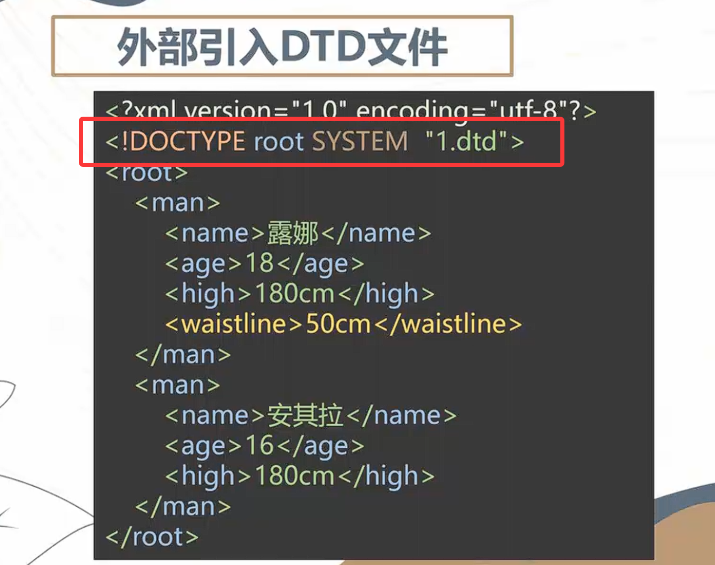 可以先把 DTD 的代码写到一个 dtd 文件中,再使用本行进行外部引用