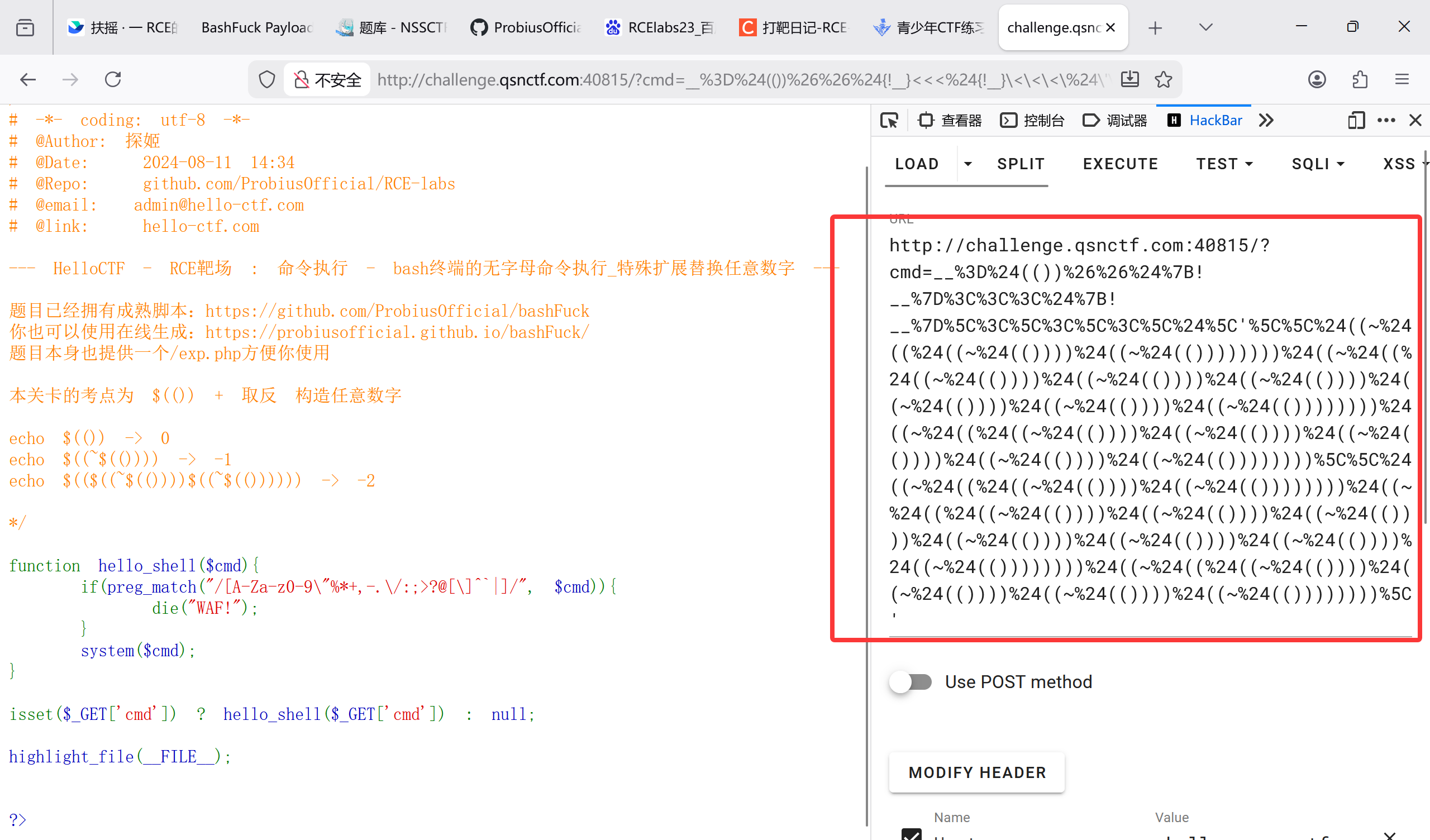 这里要注意的一点是,我们随后是利用长度为 5 的绕过方法去创建 shell 反弹,里面的\都需要换成\,这也要求环境比较兼容