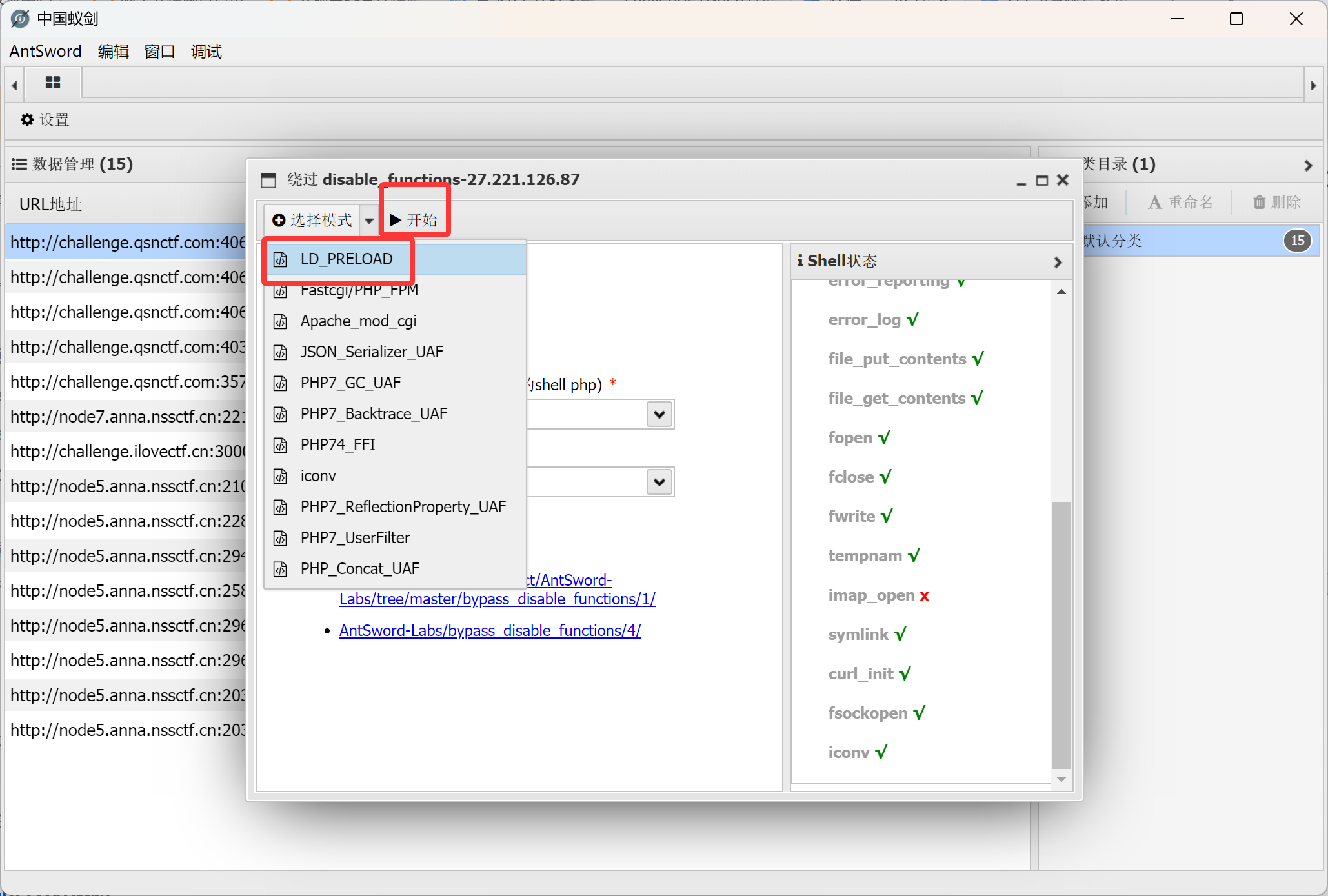 在蚁剑中先正确填写 URL 和密码,右键加载如下插件