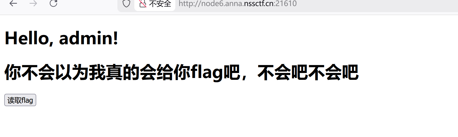 | <!DOCTYPE html> <html lang="zh"> <head> <meta charset="UTF-8"> <meta name="viewport" content="width=device-width, initial-scale=1.0"> <title>Hello Page</title> </head> <body> <h1>Hello, admin!</h1> <h1>你不会以为我真的会给你flag吧,不会吧不会吧</h1> <form method="POST" action="/"> <input type="hidden" name="filename" value="fake_flag.txt"> <button type="submit" class="btn btn-login">读取flag</button> </form> </body> </html>